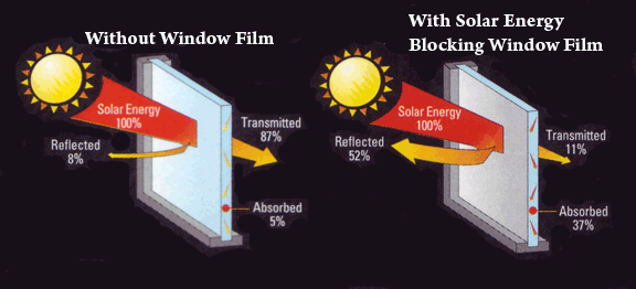 By using films that can block out 70 percent or more of the sun’s rays this will help cut down on air conditioning needs. This, in the long run, can cut down energy costs by up to 10-18 percent per month.