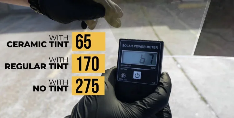 We used a BTU meter to measure the sun’s heat. We compared a clear ceramic window film (70% shade) to a very dark non-reflective window film (5% shade), and the ceramic window film still performed almost 3 times better in heat rejection.